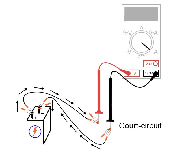 Lorsqu'un multimètre placé en position mesure d’Ampères ou ampèremètre est placé en série avec un circuit, il ne subit idéalement aucune chute de tension lorsque le courant le traverse. En d'autres termes, il se comporte comme un morceau de fil, avec très peu de résistance d'une sonde de test à l'autre. Par conséquent, un ampèremètre agira comme un court-circuit s'il est placé en parallèle (entre les bornes d'une source de tension importante). Dans ce cas, il en résultera une surcharge de courant qui si trop importante pourrait endommager l’appareil (ou brûler son fusible de protection). Pour les mesures qui nous concernent je suggère de placer d’abord le lecteur en position 10A.